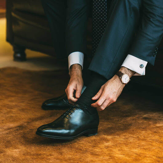 Black, and nothing but black. Your shoes should be simple, and with as few lines as possible. Our go-to tuxedo shoe? This wholecut by Carmina. A tuxedo looks only as good as the shoes worn with it, and a shoe of luxury construction can be relied upon for years.